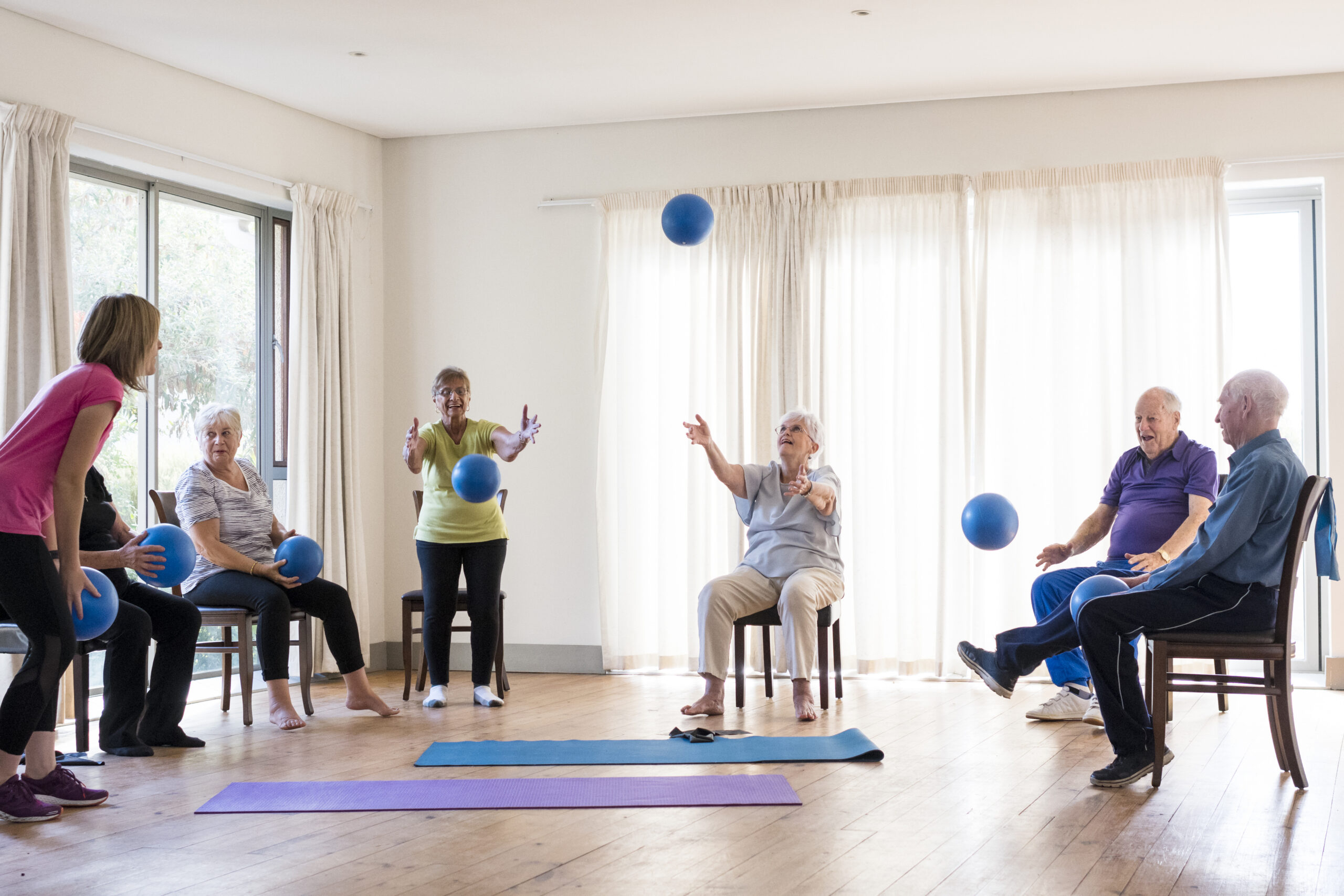 Active seniors at an exercise class playing with resistance balls